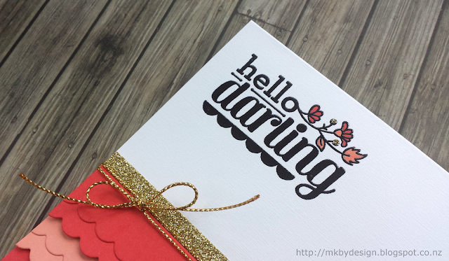 To finish off the card and to add a bit more detail, I tied some Gold Cord Trim around the card front, overlapping the Gold Glimmer Paper and the first Watermelon Wonder scallop trim.